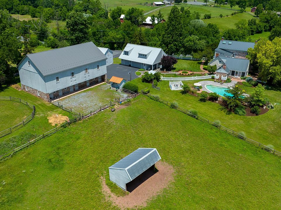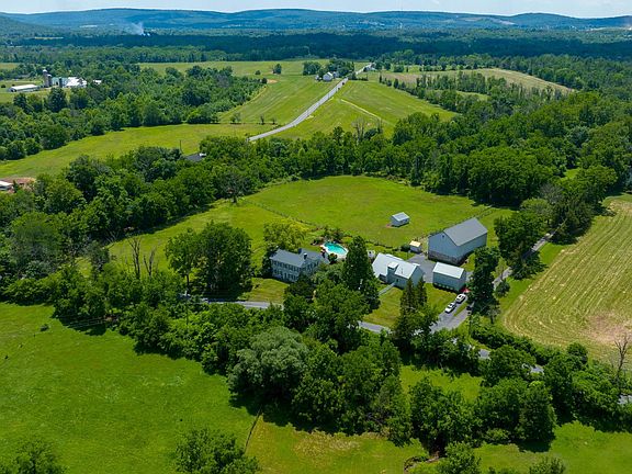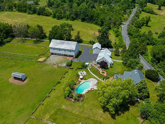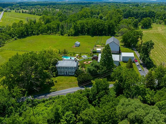Scenic, Historic Gentleman's Farm Nestled on a sprawling 7.35 acres in serene, private setting enhanced by meticulous landscaping lining the brick and stone walkways and Monocacy Creek flowing through your property is a one-of-a-kind, historical society tour home with gorgeous old-world character and contemporary luxury. Horse lovers will rejoice over two peaceful pastures with run-in shed, a large horse-riding ring, a barn with new metal roof, four stalls, wash area, feed pump for well, a two-story wagon bar with large double doors, concrete floor and corn crib. Nearby, a 3-car garage with slate covered patio, metal roof, built-in cabinets, garden sink, and summer kitchen with tile floor, sink, wine room, outdoor shower, and sauna. Past the lovely stone and stucco exterior and up the covered front porch to the main entry, the wooden stairs and hardwood floors of the 3-story foyer make a great first impression. On one side, you have the elegant dining room with the home’s original chandelier, while on the other is the grand living room, both of which boast fireplaces with decorative wood mantles, crown and chair rail molding, and large, deep-set windows. Follow the hallway brightened by skylights to the incredible kitchen where you’ll find a clay tile floor, cathedral ceiling with exposed beams, huge eat-in island with two vegetable sinks, granite countertops, stainless steel appliances including a double wall oven, built-in dishwasher, and electric cooktop, double sink, snack warmer/crisper, beverage fridge, and a spacious breakfast room, brightened by massive windows, double doors to back patio and door to the side patio. Choose to relax in the inviting den, previously an old smokehouse, with walk-in stone fireplace with wood stone inset, cathedral ceilings with exposed beams, and built-in cabinets, or opt for the spacious family room with hardwood floors, walk-in stone fireplace with slate floor and bread oven, exposed beams, and built-in cabinets. Nearby is a mudroom with built-in murphy bed, a laundry room, and a full bathroom with tub/tile shower, while a back staircase offers another route up to the second level where high ceilings and hardwood flooring leads you to the back bedrooms and hallway bathroom with tile shower and floor, vaulted ceiling, and built-in cabinets. Both secondary bedrooms have hardwood floors, ceiling fan, and built-ins, while one enjoys its own wood fireplace and the other has a cathedral ceiling with dormers and walk-in closet. The awesome Master Suite is elevated by high ceilings, deep set windows, and random width flooring, as well as a built-in bed frame & headboard, walk-in closet with built-in shelving, a built-in bench, and cabinets by a tile-front wood fireplace, and a private bathroom with tile walk-in shower and two pedestal sinks. Work without distractions in the third-floor office featuring carpeting, built-in desk and cabinets, cathedral ceiling with two skylights, and walk-in cedar closet. Over the garage is an apartment offering an investment opportunity, space for guests, or ultimate game room, featuring a kitchenette, bedroom, full bath with tile flooring and walk-in shower, plus cathedral, beamed ceilings throughout the main living area. Turn up the in-house stereo system as you relax the shaded and private side brick patio or in the nearby hot tub. Or listen to the trickling water of the lovely stone waterfall feature as you lounge on the sprawling concrete patio by the granite pool.