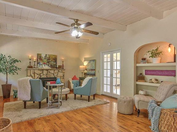 3 br/2ba single family home, hardwood floors, dual paned windows, french doors front and back and in between kitchen and very large living room, back porch, paved driveway and front yard for multiple vehicles...Room for RV(s) Bonus! PLUS detached 500 sq ft studio cottage/1/2 bath for use as office, art studio, 4th bedroom. Vaulted beam ceiling, saltillo floors, laundry, and decks on both sides.