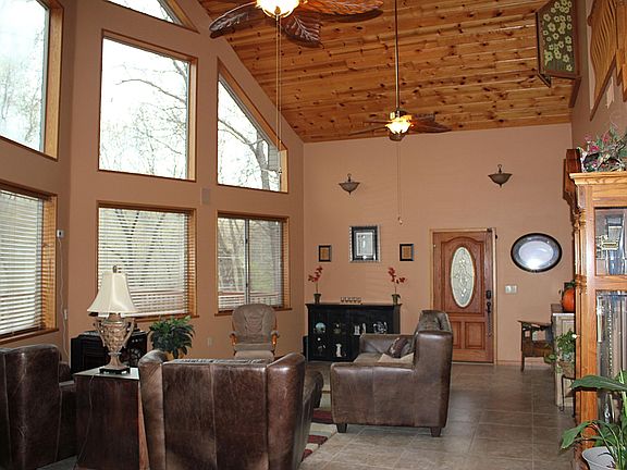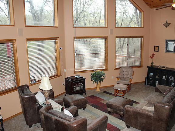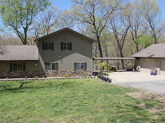 Secluded 1.5 story on 6.15ac, Colorado lodge style home, 3 car detached garage workshop, Covered RV parking & amazing Hydroponic Green house. Enjoy interacting w/wildlife, deer & turkey. Home features 24 ft cathedral ceiling in knotty pine, 30 ft wall windows, GRAND OPEN floor plan. Spectacular designer granite counter tops, 20 inch porcelain tile floors, molded solid oak window & door casements, 9 ft ceilings, 2x6 construction, 2 skylights & one-of-a-kind bent laminate oak banister spindles. Open-Lofted Master suite. Secluded among trees & nature. 1128sqft 3-car garage/workshop has insulated 6 inch wall construction w/pellet stove & air conditioning. RV Carport & 50amp hookup. 10x20 functioning Hydroponic Green House & 10x20 shed. Easy commute to Springfield or 4 miles to Nixa shopping.