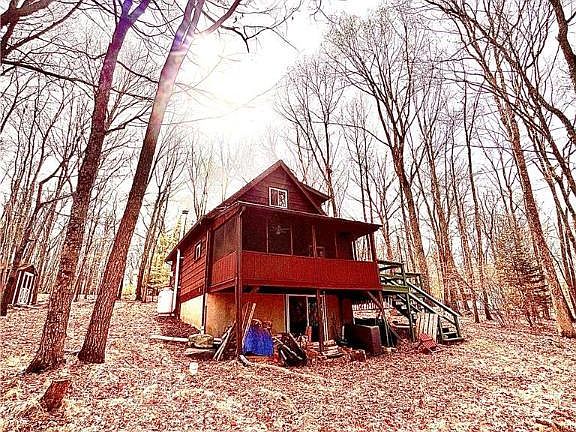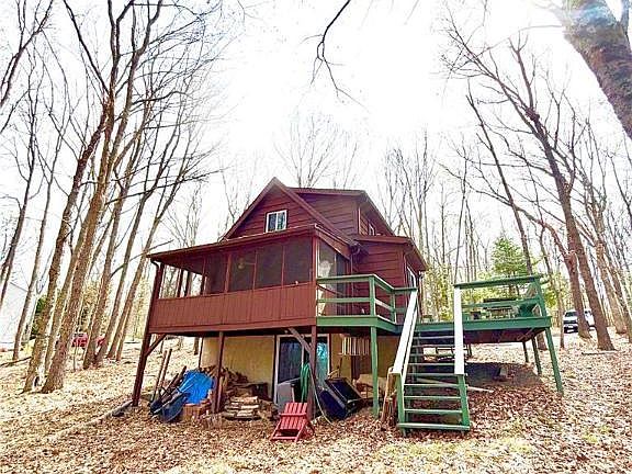 This Open concept chalet offers a rustic feel in the woods and is nestled on a 1.03 acre lot that adjoins state game land, just 90 minutes from NYC & Philadelphia. The first floor consists of a nice size living room with a propane fireplace, kitchen with a large pantry open to the din area overlooking a large deck. The bathroom has been completely remodeled offering a tile shower & tile floor. The second floor is a large loft bedroom with plenty of space for an office. The basement has a full bath, the possibility of additional living space with a walk out basement, wood stove, plenty of storage and laundry. There is a screened in porch overlooking the wooded lot and offers a view of the state game lands & a gorgeous sunsets. This Is a great get away or a primary home for an affordable price.