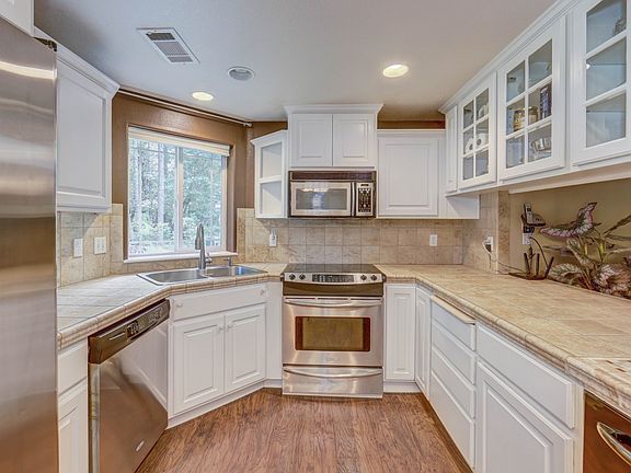 Beautiful Custom Designed Home! Sitting on gated, private 4.39 acres in a park like setting this home was built in 2003 and features 4 bedrooms (2 Masters), 3 bathrooms, approx.. 2070 sqft., an open floor plan and is handicap accessible. Nice country kitchen with modern stainless steel appliances, Built-in Trash Compactor, tile counters w/eating bar and lots of cabinets. The living/great room has laminate flooring and corner fireplace. Dinning area with door to back patio. Charm throughout this well designed home. Main master bedroom w/walk-in closet, carpet, ceiling fan, french doors to back patio w/dedicated breaker for hot tub, master bath w/tile floor, counter and shower. 2nd master has laminate floors and it's own access. Covered patios in front and back! Detached, oversized garage w/drive through doors. In ground sprinklers, nice backyard, fenced property with security gate. Beautiful wide trails through your own forest. Room for all the toys! Close to town conveniences! Home Warranty included!