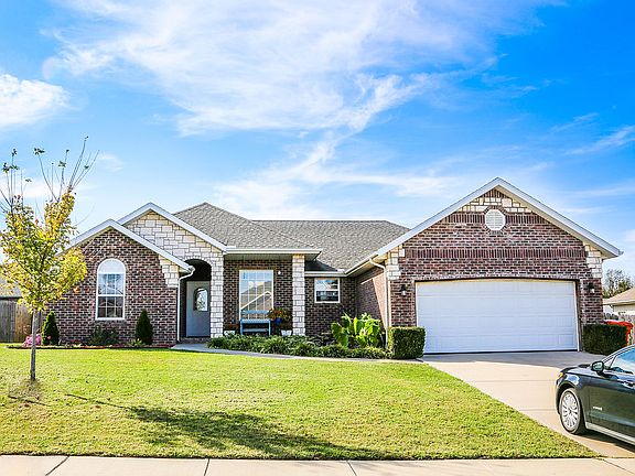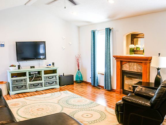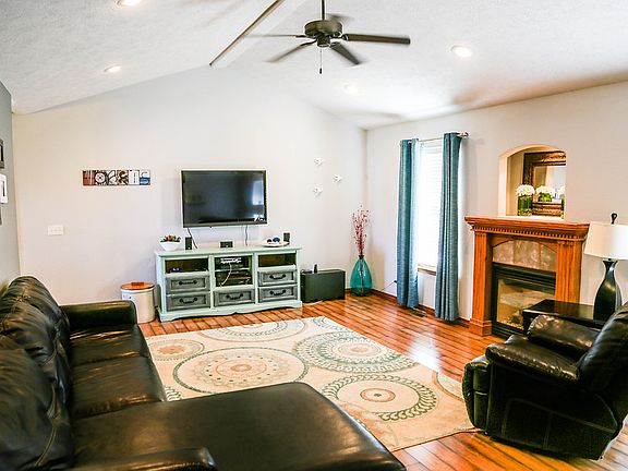 You will want to see this gorgeous all brick and stone front home. Sit on your front covered patio and listen to the soothing sounds of the water feature. Go inside and you will see the upgrades this home has to offer. Versailles pattern tile floor in kitchen, baths, and laundry rooms. The remaining rooms have beautiful wood flooring. No carpet in this home. The kitchen has plenty of cabinets with matching black appliances and sitting bar. The dining room has a large picture window overlooking the water feature with raised ceiling. Popular split bedroom floor plan with the mater bath featuring a jetted tub shower combo and dual sinks with custom faucets. Other features of the home are bullnose corners throughout, built-in cabinet in the hallway, large family room with vaulted ceiling and gas fireplace with recessed built-in above it, and storm doors on front and back. 2nd bedroom has vaulted ceiling. Good size backyard with trees and full privacy fence.