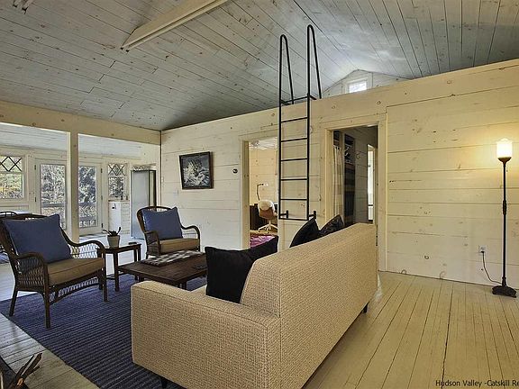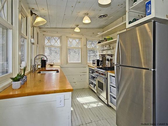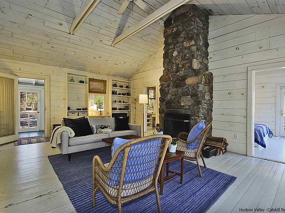 English Cottage Inspired Country Retreat on almost 10 acres with stream and gardens. A lovely sense of sophisticated simplicity envelops you upon entering the warm inviting interior. Bright airy gathering room with cobblestone fireplace lets one enjoy entertaining with friends or a quiet weekend read. Soaring ceilings. All rooms surrounded by windows. Sliding Barn doors. Charming cooks kitchen expertly detailed. En suite MBR, with private office and secluded outdoor deck is on one side of the house while the other 2 bedrooms and second bath are on the other. Both the MBR and guest bedrooms have their own private outdoor shower and changing areas. French Doors from the main rooms lead to extensive multi level decks with vining wisteria and outdoor lighting. Sweeping lawn leads to cascading creek and over to more of your acreage to walk, hike and mountain climb. Sweet gardens, outbuilding and picket fence all add to this serene picture. Perfectly located with Minnewaska state land abutting and near to restaurants, shops, farm markets, brewery, orchards, and the entrance to Minnewaska and Mohonk Preserves. Clean lines and a simple beauty make this fresh and lovely property a most desired retreat.