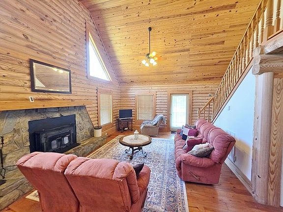 Wood-burning fireplaceHandcrafted log cabin retreatTwo-car garageExpansive front porchStocked pondsTwo stocked pondsHeart pine flooring