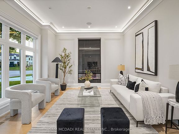 Welcome to 371 Willis Drive, an extraordinary custom-built estate by award-winning architect Keeren Design, ideally located in West Oakville. Inspired by classic French chateau architecture, this home features a timeless white stone exterior, elegant black-framed windows and meticulously landscaped grounds. Spanning 7,500+ SF across three levels, it offers 4+3 bedrooms and 7 bathrooms, each crafted with exceptional detail. The main level features an open-concept layout with 10-ft ceilings and premium finishes. The chef's kitchen is a masterpiece with an oversized island, GEOLUXE porcelain countertops and backsplash, and Thermador built-in appliances including a 6-burner cooktop & 72" refrigerator. It flows seamlessly into the great room, where 20-foot ceilings, a linear gas fireplace, custom built-ins & expansive floor-to-ceiling windows create a grand and inviting atmosphere. A formal dining room, living room, bar, home office, powder room & mudroom complete this level. An oak staircase with glass railings leads to the upper floor, home to a primary suite with a custom walk-in closet & spa-inspired ensuite featuring radiant heated floors, freestanding tub, dual vanities & double rainfall shower. Additional bedrooms each have walk-in closets & private ensuites. The finished lower level adds 3 bedrooms, a full bathroom, modern kitchen, recreation area, media room & office. Elegant design elements are found throughout, including tray ceilings with LED lighting, large aluminum curtain wall skylights, built-in speakers & wide-plank oak flooring. Outdoors, enjoy a private backyard oasis with a covered concrete patio, koi pond, Hydropool swim spa & lush gardens. The front offers a heated granite driveway on reinforced concrete for up to 8 cars, leading to a 3-car garage with concrete flooring. Located near Appleby College, top schools, parks, Lake Ontario & major highways, this residence epitomizes modern luxury living in one of Oakville's most prestigious neighborhoods.