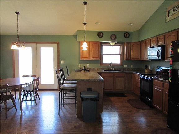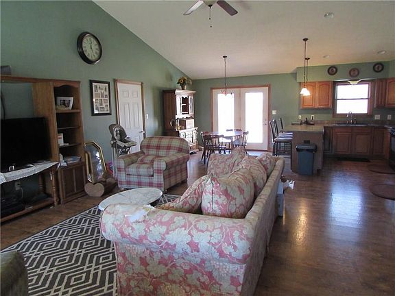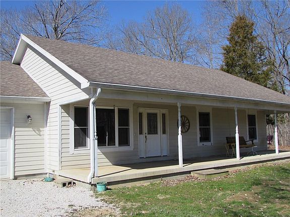 Here is the country home you have been looking for! Custom built ranch on 5 acres with small pond. Open concept, vaulted ceilings, poplar woodwork and 6 panel doors. Master bath with double sinks and whirlpool tub. Lots of closet space! Kitchen appliances are less than 2 years old, extra large and deep resin sink. Deck on back accessible from Master and Dining area. Furnace is electric with outside wood furnace for backup. Covered front porch. Home sits back off road.