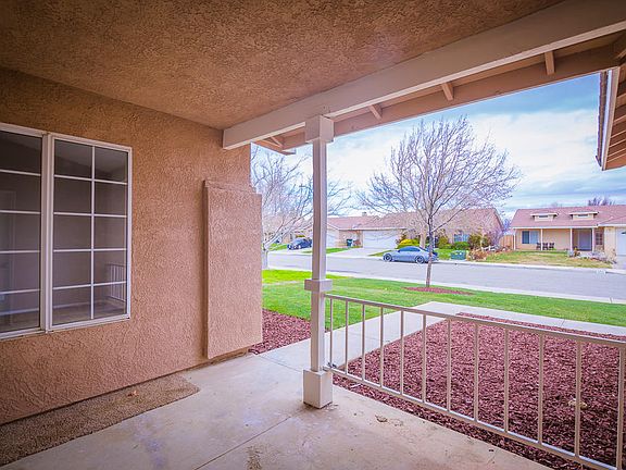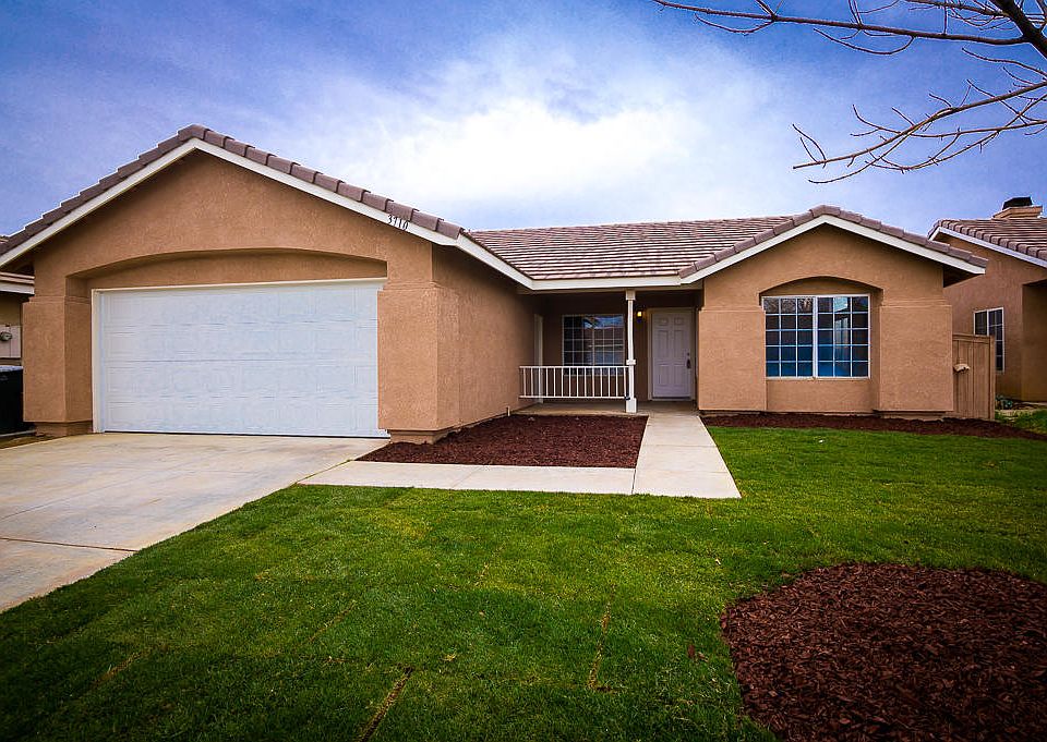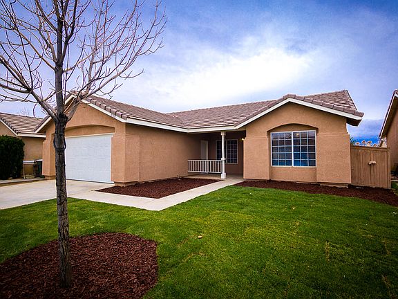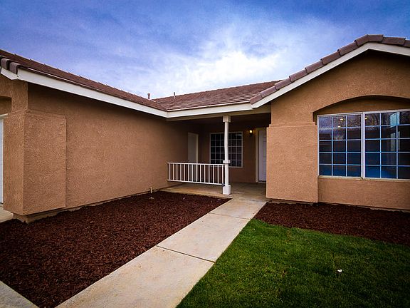 Exquisite Rosamond Home, near fwy and schools! Newly laid sod in front yard. Cemented walkway leading to front porch with square 14" Black wall lantern, Custom exterior Swiss Coffee paint, Colonial white short panel roll up garage door. Enter into beautiful high ceilings living room with shag carpet and brushed nickel light fixtures; family room leads into immaculate kitchen featuring 18"x18" ceramic tile, white cabinets with modern stainless steel hardware, white tiled countertop, white double sink with single-handle pull down stainless faucet, white appliances to include; dishwasher, stove, & range hood, recess lighting, Hampton Bay 5 light brush nickel chandelier, and glass sliding door leading to backyard. All bedrooms display newly installed shag carpet,