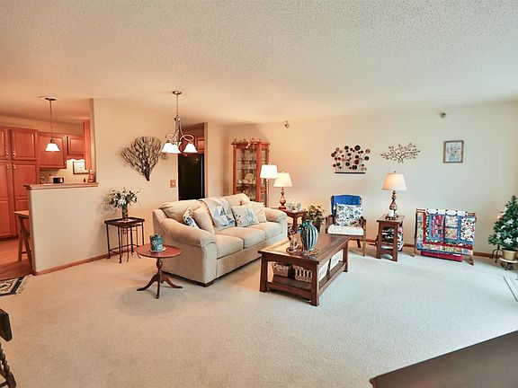Enjoy an excellent, carefree lifestyle in this one level home with convenience to schools, parks, churches and shopping. The open floor plan offers 2 bedrooms, 2 bathrooms, an office/den area, laundry room with storage and an updated kitchen with corian countertops and newer appliances. The bright and spacious living room has access to a maintenance free deck with an electric rollout awning, giving you shade in the afternoon. Master bedroom has large walk-in closet & master bath. Oversized 2 stall garage with 5 x 14 storage closet and shelves. This secured building offers a commercial elevator, large community room, exercise room and a large foyer. Association dues include: interior and exterior maintenance, lawn care, snow removal, building insurance, basic cable, sewer, soft water & garbage.