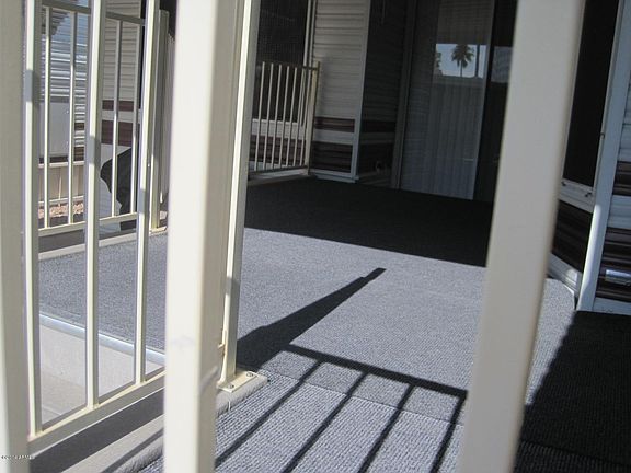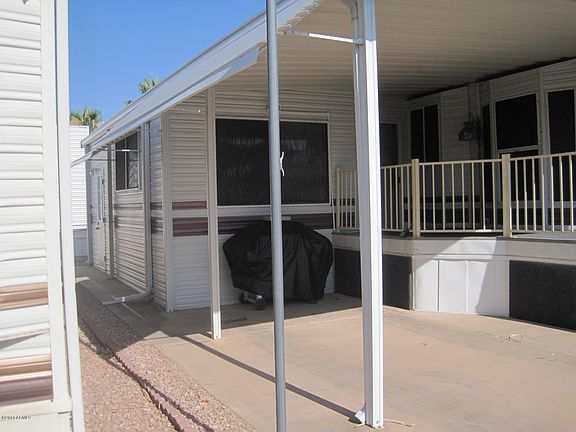 Great value for this beautiful home! Located in the gated, 55+ active adult community of Golden Vista Resort where you own the land. No lot rents or rent increases. Located in the pet section, the home is East facing & offers views of the Superstition Mountains. Large deck adds outdoor living space. Tastefully furnished & clean. Laminate flooring in park model updated 11/2012. Fully equipped kitchen. Lift bed & tons of built in storage in master bedroom. Master bath has linen closet & tub/shower combo. Large interior utility room off AZ room has stacked washer/dryer, desk & large closet. Exit door from the utility room to the back patio. Attached exterior workshop has water softener & separate water heater for washer/dryer. Seller is providing a 1 year home warranty plan from One Guard.