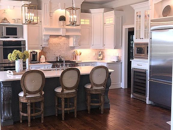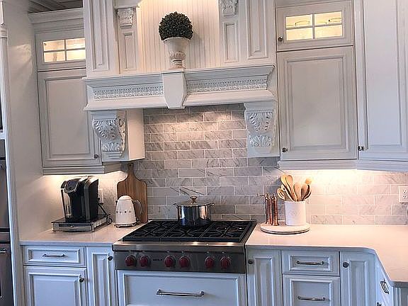 Beautiful white designer kitchen with white quartz countertops and Carrera marble backsplash! Built-in refrigerator with WOLF gas cooktop, Double convection oven’s.