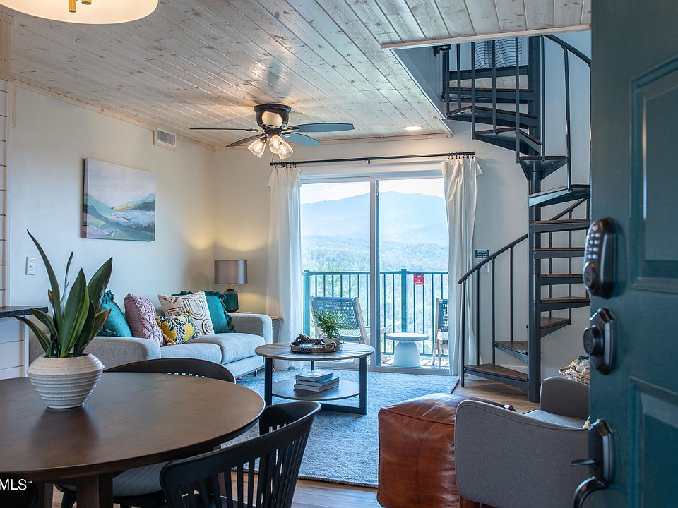Gross profit of over $55,000 with Net Profits of $26,000+ generated from a similar unit with the same owner managed by Prestige Vacation Rentals. The numbers speak for themselves! Absolutely Stunning 1 BR/1BA condo with a loft and the best views in the Smokies! From the moment you step foot in this unique property you will be in awe of the attention to detail from the ceiling to the floor! The entire unit has been professionally remodeled and designed in 2022. The kitchen features quartz countertops and all new stainless-steel appliances. Gorgeous high quality luxury vinyl plank flooring throughout with high quality tile in the bathroom. Large, tiled shower featuring Bluetooth fan, nightlight and speaker. Master Bedroom offers amazing views as well as a King size bed and very large wall mounted flat screen TV. The main living area features a wood burning fireplace (Large wall mounted flatscreen TV), dining area, sliding glass doors with a deck and AMAZING VIEWS! Ship Lap walls throughout handsomely accented with natural tongue and groove ceilings! Follow the antique spiral staircase up to the cozy loft area with a King size bed and VIEWS! HOA includes internet, cable tv, maintenance structure, pool, roads, water/sewer tennis court and more! This unit comes completely turnkey ready! Call for a showing today!