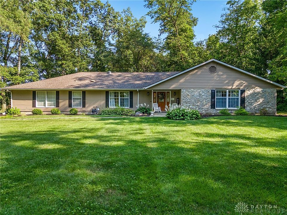 Welcome to your perfect sanctuary! This stunning 4-5 bedroom, 3000 sq ft ranch home is nestled on 3 acres of serene landscape in Cedarville Township, 3.6 miles from Cedarville in the highly sought after Cedar Cliff School District. This exquisite property combines luxury, comfort, and privacy, making it an ideal retreat for those seeking a peaceful lifestyle. Numerous updates to this beautiful home will make this a dream home for the new owners! As you step into the expansive great room, the vaulted beamed ceilings and a floor-to-ceiling brick fireplace create a warm and inviting atmosphere. The abundant windows flood the space in natural light, offering breathtaking views of the surrounding nature. Enjoy cozy evenings or your morning coffee in the additional family room, complete with a second fireplace and new windows that provide a picturesque overlook of the private backyard. The kitchen features gorgeous cherry cabinets paired with luxurious granite and Corian countertops. Stainless steel appliances complete the gourmet kitchen, making it a chef's dream.The updated laundry room and full bath are conveniently located on the main level, adding to the functionality and ease of living in this beautiful home. The spacious primary bedroom offers a tranquil retreat with an ensuite bath, providing the perfect escape at the end of the day. Three additional large bedrooms ensure ample space for family and guests. The versatile flex room can be used as a home office or a fifth bedroom, catering to any buyers unique needs. Set on 3 acres of lush land, this property offers endless possibilities for outdoor activities, gardening, or simply enjoying the beauty of nature in your own private oasis. Experience the perfect blend of luxury, comfort, and seclusion in this remarkable Cedarville ranch home. Your dream lifestyle awaits.