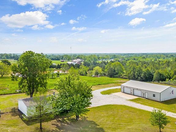 The property features a serene stocked pond and a spacious shop with four large bay doors and gravel driveways, suitable for storing vehicles or even operating a business. The shop also includes a studio apartment outfitted with separate electrical and septic systems.