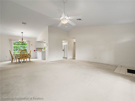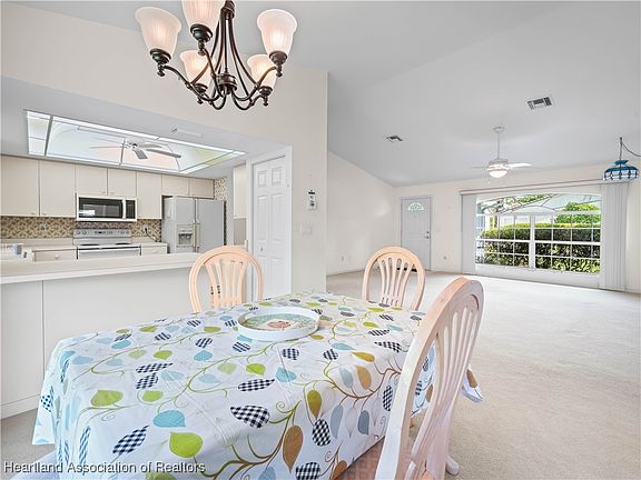 LOCATION! LOCATION! Mrs. Clean lived in this pristine 2 bedroom 2 bath home! Curb appeals abounds! Enter through the screened front porch into the open concept, light and bright great room with cream colored carpet throughout, cathedral ceilings and expertly positioned plant shelving. The great room flows seamlessly to the dining room and kitchen. The bright, very functional tiled kitchen has plenty of cabinetry for storage and lots of counter space and a L shaped bar for extra seating. Across from the tiled kitchen is the dining room with sliding glass doors leading to the enclosed lanai. Retreat to the serene master suite, complete with en-suite bathroom with walk-in shower and ample walk-in closet space. The 2nd bedroom offers versatility for guests or home office, while the landscaped backyard provides a tranquil oasis for outdoor gatherings. A nice 8X10 shed also comes with this home for your extras! Roof is 6/2022, Carrier AC 2015 and water heater 2018.