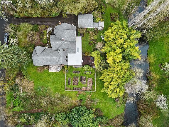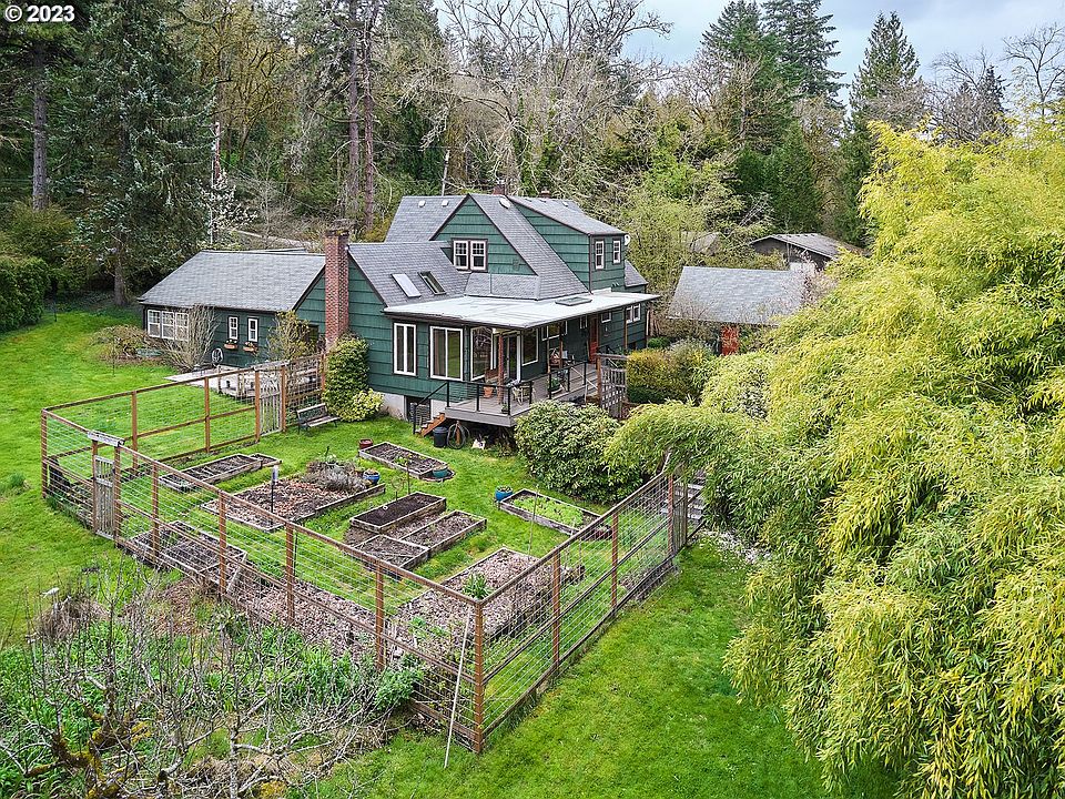 This charming home and garden was built in 1932 and has since been expanded twice. An idyllic 4 bedroom 2.5 bathroom house built on an extra large lot of .46 acres with an adjacent 2nd lot of .27 acres, all sold as one. Nestled off the road and above Kellogg Creek, the living space is surrounded by trees, year-round flowering cutting gardens, and a contained bamboo grove. The home's elegance includes exquisite SW-facing leaded glass windows, hardwood flooring, arched wall openings, cove ceilings, picture rails, and original glass door knobs. The property features an abundance of storage and bonus spaces. The detached, updated garage with an adjoining multi-window greenhouse provides workspace aplenty. The vaulted-ceiling family room (1958) and additional primary suite with a second kitchen and second private entrance (1995) enhance the comfort and provide possible multi-generational living spaces. 2024 added a new water electric heater, new east-wing roof, and chimney tuckpointing. Windows highlight greenery, privacy, and spellbinding creek views (and sounds). Decks, patios, and fenced gardens with raised beds beckon you outside. In Clackamas County, just 8 miles from downtown Portland and 1.5 miles to Light Rail, this country-like charmer includes mature landscaping, berries, and apple trees, and is frequented by ducks, deer, hawks, herons, and songbirds. Kellogg Creek flows year-round and will again include salmon and steelhead. Magical!