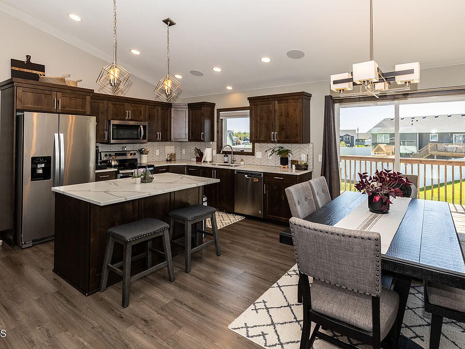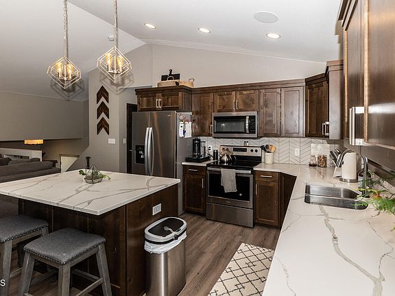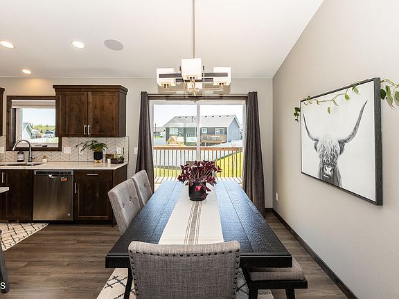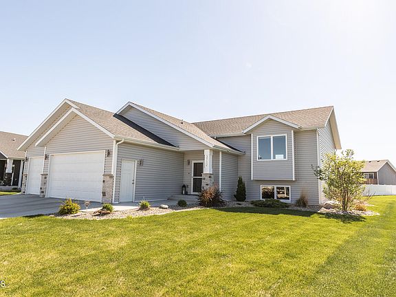 BEAUTIFUL nearly new, fully finished home in South Bismarck! This home features custom cabinets, quartz countertops, custom backsplash, center island and stainless steel appliances. You'll love the open floor plan with cathedral ceilings! There is a primary suite, 2nd bedroom and 2nd bathroom on the main floor. The lower daylight level features a spacious family room with gas fireplace and built in beverage center, 2 additional bedrooms, bathroom, laundry room and under stairs storage area. There is a 10' X 12' deck with stairs to the custom paved patio and the yard is complete with sprinkler system. Located near recreation path and playground. Don't miss out....arrange your showing today!