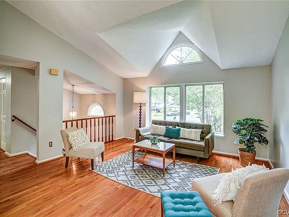 Main level hosts an open concept living room with vaulted ceilings, crescent window, and hardwood floors.