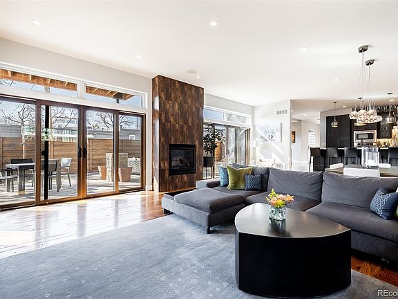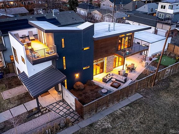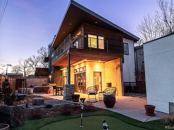 The main floor features a large and bright home office, a wrought-iron floating staircase, and an open-concept kitchen and dining area, seamlessly flowing into the living area for easy entertaining. The kitchen boasts high-end Thermador appliances, including an ice machine and wine cooler. Indoor-outdoor living is maximized through the south-facing wall of sliding doors that open to the massive outdoor patio. Enjoy the backyard and patio sanctuary, which features stunning perennial landscaping, a dedicated barbeque area, a fire pit, and two water features. Upstairs, wide hallways and tall ceilings lead to two guest bedrooms with an attached bathroom, laundry room, and primary suite. The light-filled primary suite stuns with a gas fireplace, French sliding doors, and a private balcony that offers views of downtown Denver. The spa-like bath includes double vanities, a makeup vanity, a walk-in shower, and a soaking tub. A walk-in closet completes the five-star resort feel of this primary suite. A welcoming roof deck patio awaits on the top floor with ample space for entertaining, enjoying views of the mountains and downtown Denver, and watching fireworks. This home is within walking distance of all that LoHi offers, including the best restaurants, shopping, cocktail bars, coffee shops, parks, and more. This extremely rare oversized 6,240 square-foot LoHi lot is zoned U-TU-B2, which allows for a detached accessory dwelling unit (ADU). An off-street parking spot further complements the value add of an income-producing short-term rental or convenient cottage/guest house.