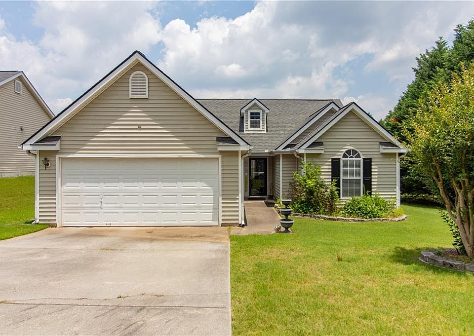 Come see this beautiful well-kept 3-bedroom ranch home in Fairburn. No HOA and minutes from 85. Slatted laminate flooring and vaulted ceiling in the large living room, with a sizable formal dining room, featuring a beautiful crystal chandelier. The eat-in kitchen has granite countertops, white cabinets, white tiled flooring and a gas stove. Have your coffee sitting on your back patio, admire the beautiful flowers blooming in your quaint private backyard. Retire to your Owner's suite for the night, it's sizable and carpeted with a lovely on suite that includes a tall granite topped vanity and a beautifully tiled shower with a built-in bench for comfort. Two additional bedrooms can be found in the front of the house, also carpeted sharing a full bath with shower tub combo. This house has lovely curb appeal and flows into the cul-de-sac.