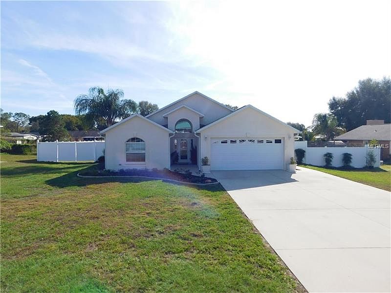 This gorgeous super-clean Zephyrhills Florida home has a spacious layout featuring a great room, large kitchen, bright foyer, split bedroom and volume ceilings. Many upgrades have been included in this Wayne Butterfield built home: Double-pane windows, wood floors, french doors, breakfast nook door that opens to a private covered patio, extra wide concrete driveway and sidewalk! The kitchen is simply wonderful with an abundance of counter space, eye level oven, separate cook top, tons of cabinets and drawers, pantry and separate laundry room. This beautiful home sits on a large piece of property with plenty of room to park an RV and boat. The privacy fence has a double gate to allow large vehicles access to park in the side yard. There is a sunken above-ground oval pool in the backyard for those hot summer days and the concrete pool patio is great for grilling and lounging in the sun! And what a great location this attractive home is in, close-by to everything Zephyrhills has to offer yet tucked away on a tranquil road in the established neighborhood of Fort King Acres. The AC is new (installed December 2016). Also, there are NO HOA or CDD fees!