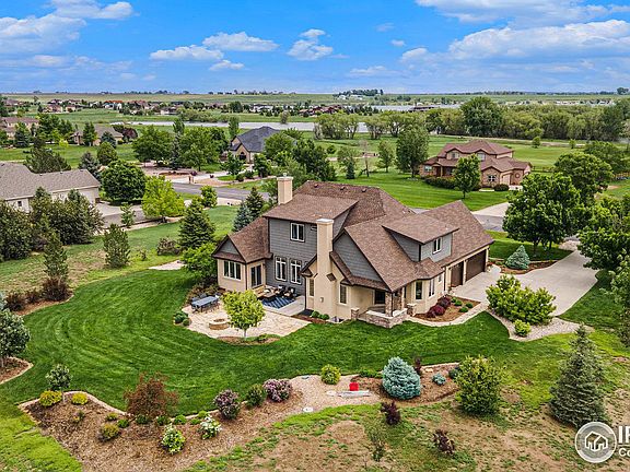 STUNNING home with breathtaking views of the Rocky Mountains, backing to Open Space and overlooking a private lake - A Colorado Dream come true! Over 2 acres of privacy and serenity to enjoy in this enviable Soaring Eagle Ranch neighborhood. Beautiful and well designed landscaping and gardens are watered from non-potable water supplied by the HOA ; sprinkler systems in place. Relax and unwind on the west facing back patio while watching the BREATHTAKING sunsets and staying warm & cozy at night around the stone fire pit. Elegance, style & attention to detail abound in this impeccably maintained one owner home. Hand troweled walls, knotty alder cabinetry and trim, vaulted ceilings, beamed ceiling in living room, granite in 2 kitchens and in bathrooms. walkin pantry in main floor kitchen, 2 furnaces, 2 air conditioners, 2 water heaters, whole house humidifier, & french drain system all professionally inspected every single year. 6,295 finished sq.ft, 2 en-suites + 5 more spacious bedrooms, 6 bathrooms total 2 of which are Jack & Jill, loft office area, mudroom with custom cabinetry, large exercise room, basement rec room, 2nd kitchen in basement. Main floor primary suite includes sitting area, access to back patio, 5-piece luxury bathroom, and walk in closet. Come experience this fine property, and fall in love!