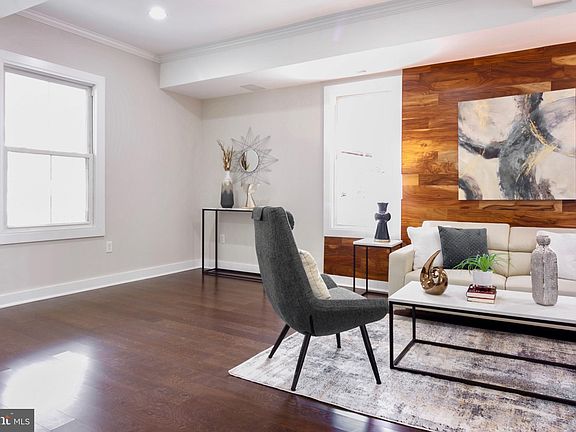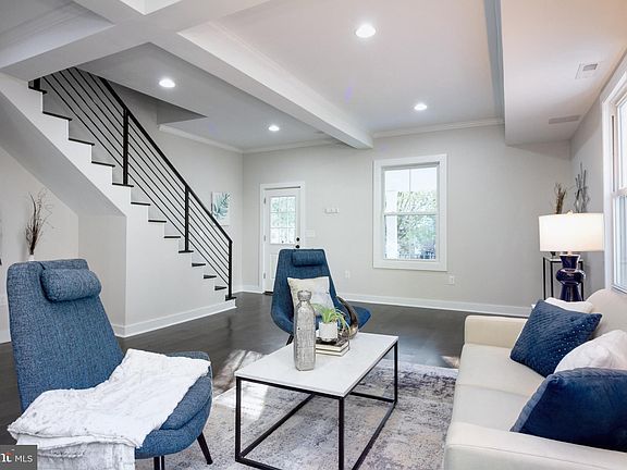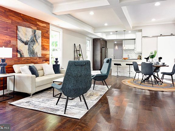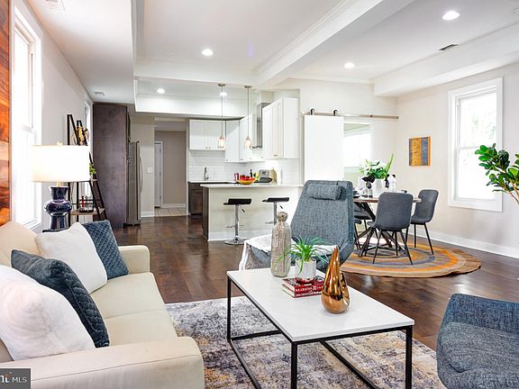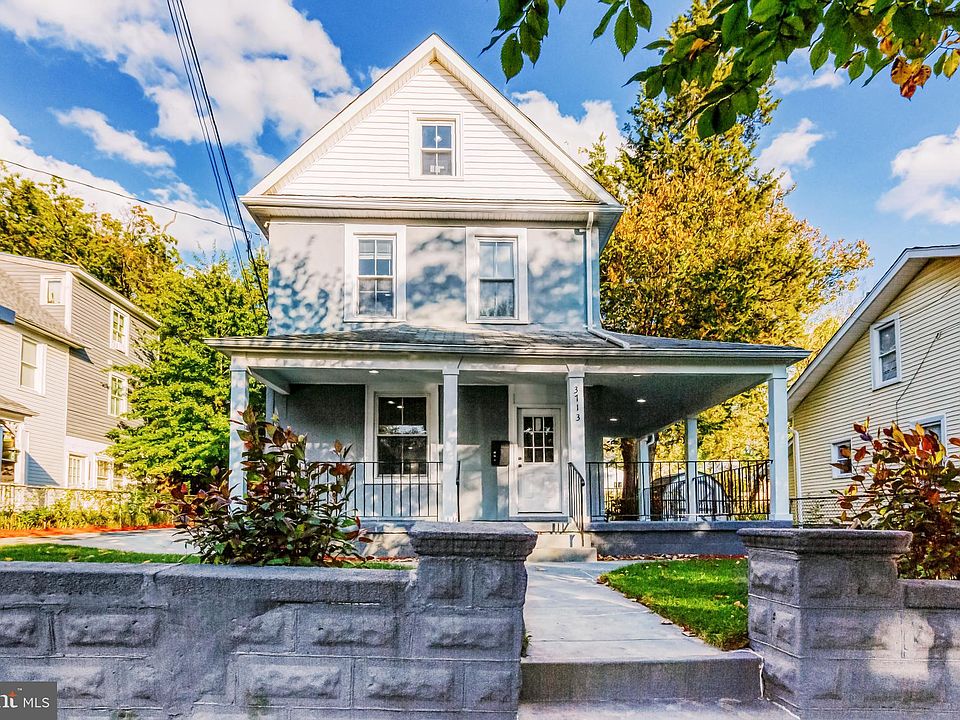 Come home to a beautifully renovated Queen Anne farmhouse in the Mount Rainier Historic District. Picture perfect location for this expanded gem, just a block from Rhode Island Avenue shops, restaurants and transportation, and four short blocks from the Washington, DC border. There's tons of curb appeal from the tree-lined street with a low gray brick retaining wall and a cute front yard. A classic country covered porch wraps around the front and side, providing the perfect place to sit and watch the world go by. Originally built in 1917, this remarkable home has plenty of architectural bona fides from a century past, seamlessly blended with new contemporary details and amenities. The main level has been transformed into an open Great Room concept with richly-hued engineer wood floors below and exquisite beams above. High ceilings and generous windows add to the sunny, spacious feel, with a section of finished wood on one side of the living area, adding an intriguing wall accent. There's also a powder room at this level for the convenience of family and friends. With five bedrooms and three-and-a-half baths, there is plenty of room to plant roots and grow. The house has been nicely built up and out, with an oversized mudroom leading out to the rear yard. A large kitchen has been completely remodeled and opened up to the living area, providing the perfect place to cook and socialize. You'll enjoy creating meals on Quartz countertops backed by white subway tile backsplashes, with stainless steel appliances, 42-inch cabinets and hanging pendant lights over the breakfast bar. A fabulous staircase ascends to the sleeping quarters. There are three bedrooms at the second level, including two master suites with designer baths, plus two more bedrooms and a full bath on the third floor under the eaves. Large windows, lots of closet space and recessed lighting is part of the package, along with central air and heat. Three exits lead out to a beautiful, leveled yard. The lot's surprising depth adds to the considerable charm and appeal; it's the perfect place for get-togethers, games, and barbecues!
