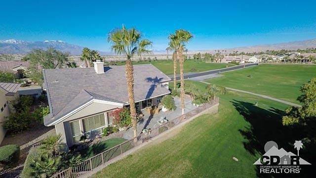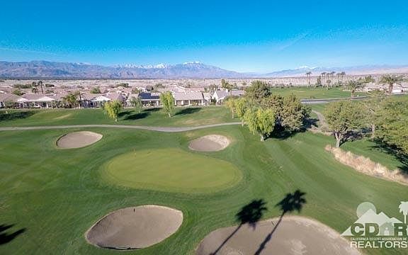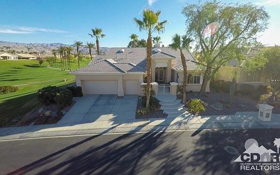 Sun City Palm Desert- St. Tropez. Sitting on a unique golf course lot, elevated high over the golf course w/a wrap-around rear/side patio providing views of multiple fairways, the softball field, Mt. San Jacinto and Mt. San Gorgonio. The rear yard features a builtin BBQ, fountain and desert landscaping. A gated courtyard, textured hardscape and glass French doors provide curb appeal. 12ft ceilings are in the greatroom; 10ft ceilings elsewhere. 20in diagonally laid tile is used extensively. Plantation shutters on all but the north facing large view window. Quartz counters in the kitchen and wetbar. Custom builtins in the dinette (buffet), greatroom (media center) and den (desk/cabinetry). The greatroom has a corner fireplace and sit-down wet bar w/U-line fridge. Master suite has a large walkin closet w/builtin storage. Master bath has dual sinks, stall shower and a spa tub.. Garage has builtin storage and evaporative cooler. Home has dual HVAC w/electronic air filtration, central vac.