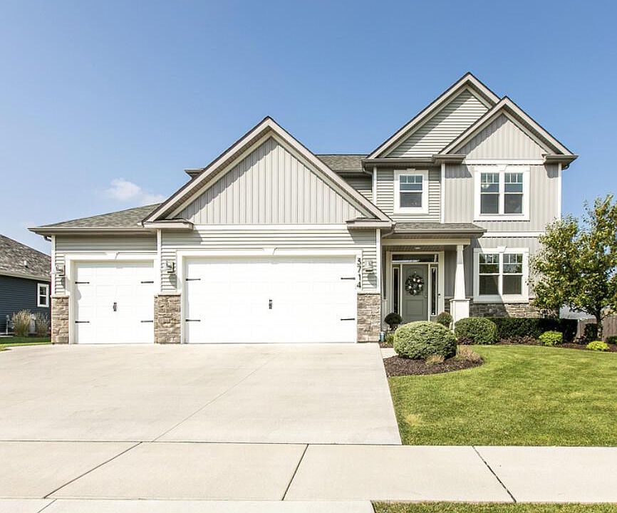 Move right into this 4 bedroom home + custom OFFICE with many upgrades. Kitchen and the great room, overlook the custom deck & private tree line yard, making great space for entertaining. UPGRADES: soft close custom cabinets w/granite, built-ins in great room and office w/ French doors, CUSTOM MAINTANCE FREE DECK with lighting, window blinds, gas fireplace, new floors and new carpeting throughout in 2021. Appliances and mounted TV's are new in 2019 and included with the home. Basement is stubbed for 3rd bathroom and ready for buyers finishing touches for a large rec room and full bath. Very well maintained furnace and 50 gallon hot water tank. Professional landscaped yard with an irrigation system and much more.