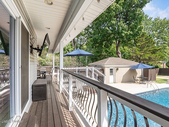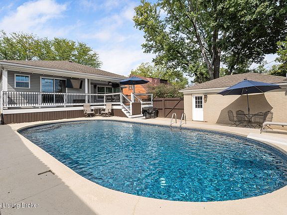 deck. A full bath in the hall, plus two additional bedrooms, one with a half-bath, complete the main level. The finished lower level expands the living space with a large family/media room, full bar with counter seating, and an open area for dining, games, or fitness. An additional room with a non-egress window, as well as a full bath, gives you many options on how you will use this space. Laundry and storage areas add convenience. Outside, enjoy a private backyard designed for entertaining with a heated inground pool, spacious deck, covered outdoor living area, and privacy fencing. A detached garage and thoughtful landscaping complete the property. Located near Seneca Park, the St. Matthews hospital corridor, dining, shopping, as well as both the Watterson