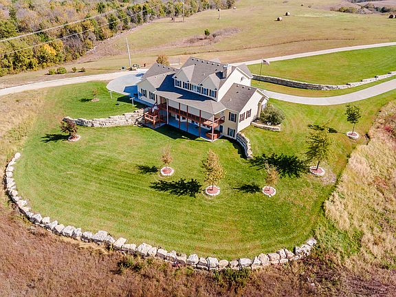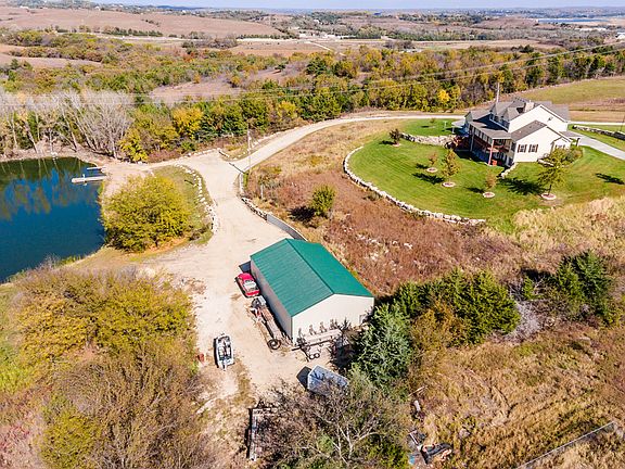 One of a kind property located on 20 acres in Manhattan school district with central proximity to the lake, the stadium & the golf course!! Beautiful two story home with full finished basement. Main floor hosts formal dining room, formal living room, great room, breakfast nook, large open kitchen, walk-in pantry, mud room, and laundry room. Venture upstairs to three additional bedrooms and bath. Lower level finishes with oversized family room, two additional bedrooms, home office and large storage area that doubles as a safe room. Step out on the covered back deck to enjoy stunning views of your private pond and shop which is perfect to house all your toys. For additional information or to preview property, call Rockhill to schedule your showing today! Please take off shoes or wear booties when showing! HOA dues are $350 annually!