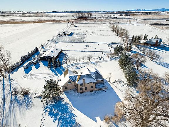 Stunning and conveniently located 9.5 acres of river frontage horse property only 10 minutes from Longmont and 45 minutes to DIA. Northern Boundary is Little Thompson River and Property is Adorned with Mature Cottonwoods. A 2-story Tudor-Style with 5 Bedrooms, 5 Bathrooms and Total of 4,788 Finished Sq Ft. Large Kitchen Opens to Bright Family Room for Entertaining and Overlooks River and Horse Areas. Master Retreat Complete with 5-Piece Bath and Walk-In Closet. Fully Finished Basement. Unfinished Vaulted Room Over Garage. 3 Car Garage. Professionally Designed Horse Facility with Custom Barn by Gardner with 6 12'x14' Stalls plus Foaling Stall, Nelson Automatic Waterers, Feed Room, Wash Stall with Hot Water, Hay Storage, Heated Tack Room, Bathroom. Facility Also Includes Outdoor 100'x200' Arena, 60' Roundpen and 6 Pastures All with Loafing Sheds, Waterers and Safe Steel and Non-climb Fencing!