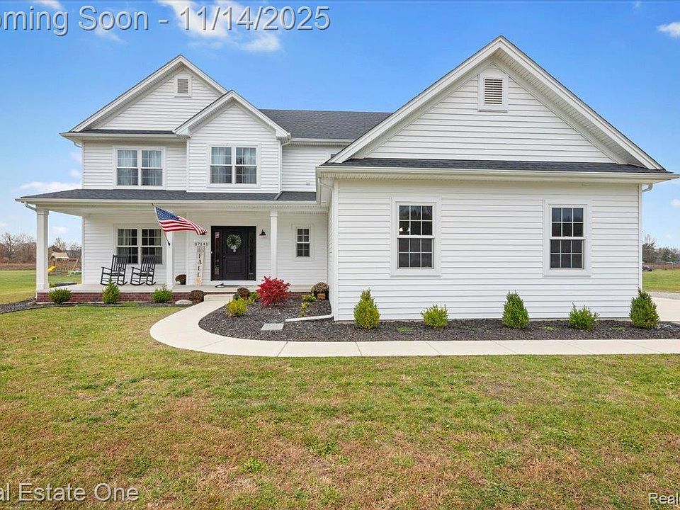 Welcome to this stunning 2022 Moretti built home, perfectly positioned on a peaceful, low traffic road offering over an acre of quiet country living with modern style and function. Featuring 5 bedrooms and 2.5 bathrooms, this nearly new construction combines timeless design with exceptional craftsmanship throughout. The main level showcases an open concept layout highlighted by luxury vinyl plank flooring, soft close cabinetry, quartz countertops, subway tile backsplash, and brand new stainless-steel appliances. A spacious walkin pantry and oversized island make the kitchen perfect for daily living and entertaining alike. Upstairs, the primary suite delivers a spa-like retreat complete with a freestanding soaking tub, dual vanity, and a walkin shower accented with sleek black matte finishes. Four additional bedrooms offer flexibility for family, guests, or home office setups. The full basement is plumbed for a future bathroom and ready for your finishing touches. Other highlights include a 3 car attached garage, 200 amp electrical service, and a wide open yard ideal for outdoor living, gardening, or even a future pool. Nestled in an area known for its outstanding schools and tranquil surroundings, this move in ready farmhouse delivers the best of country living with the convenience of modern design. Meticulously maintained home, a true turnkey opportunity.