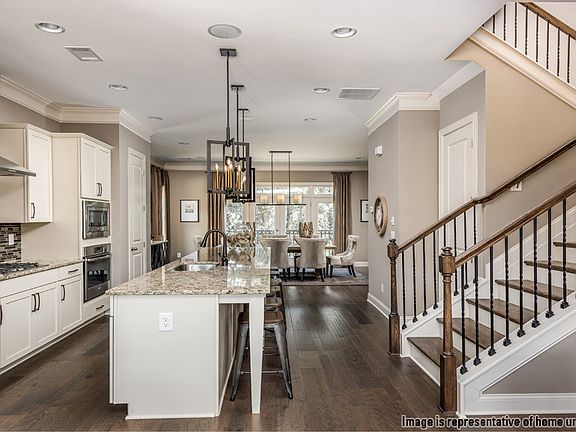 The Sutton V Plan is a three-story townhome offering 2-4 bedrooms and 3.5 bathrooms. This plan features a full bathroom and media room or guest bedroom on the terrace level. ? Create lasting memories in your new fireside gathering room - perfect for game nights, movie nights, and entertaining. ? The dining area provides the perfect space for dinner parties or special occasions. ? Spacious gourmet kitchen boasts a large island, stainless steel appliances, and ample counter space. ? Laundry room centrally located near the owner's suite and secondary bedrooms for your convenience. ? Located in the owner's suite, the owner's bathroom features a double vanity, tiled walk-in shower, and large soaking tub to indulge in after a long day.