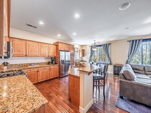 Discover the breathtaking views this beautiful 3 bed, 3 bath, 2840 sq ft home perched atop a scenic hill in Reno. Gaze out over sweeping vistas from Peavine to Mt. Rose, creating a picturesque backdrop to your daily life. This home features knotty alder cabinetry throughout with granite counters on every surface in the home. The main level showcases a formal dining and living area, the kitchen, family room, guest bedroom and full bathroom. Retreat to the lower level, which features the master suite with two impressively large walk-in closets, one with built-out shelving. Experience the full in-home theater equipped with a projector and surround sound. The large downstairs rec room offers great versatility, ideal for an office, gym, etc. Energy efficiency is a hallmark of this home which includes tankless hot water, dual-zoned heating/cooling, and solar panels which keep the utility bills impressively low, avg 62/month over the past year.