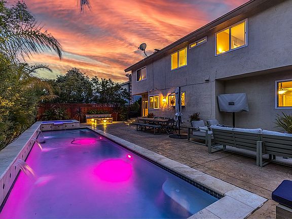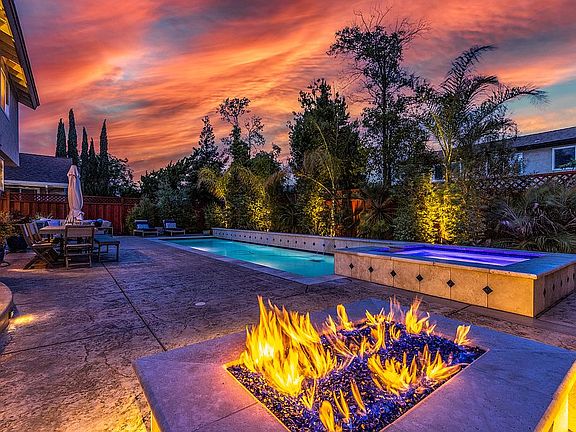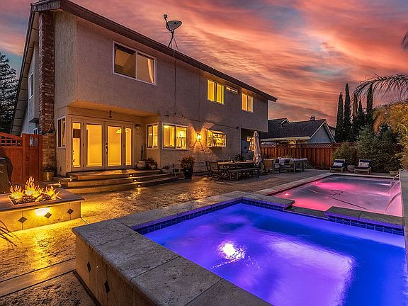 Take a close look at this Pleasanton home tucked in a prime cul-de-sac location and be impressed by its open, light-drenched interior with vaulted ceilings, wood floors, fresh interior paint, skylights, and an amazing backyard mecca for entertaining and fun in the sun. A beautifully landscaped front garden that bursts with seasonal color and foliage and an inviting walkway for guests to access the backyard. Centrally located with convenient proximity to just about everything from Whole Foods and Trader Joe's to the Fallon Shopping Center, the Livermore Outlets, and freeway access, the neighborhood is also about two miles to the popular Fairlands Park and greenbelt with walking trails and playgrounds. Top-rated Pleasanton schools, including Fairlands Elementary within a mile, Hart Middle School, and Amador Valley or Foothill High Schools, are also conveniently close. About 2,369 square feet of living space on two levels features four bedrooms and three bathrooms, including a main-level bedroom/office with a front-facing garden view and a stylish barn door entry. A nearby main-level bathroom is updated with a vessel sink, marble tile floor and walls, and a shower with decorative tile. The formal living room and dining rooms are spacious areas and include wainscot detailing and garden views. A large kitchen features granite counters and backsplash, freshly painted cabinetry, a garden window over the stainless sink, and updated appliances, including an LG refrigerator and microwave and dual Whirlpool ovens in addition to a four-burner cooktop, dishwasher, and wine refrigerator. A wood-burning fireplace with a decorative tile surround anchors the adjacent family room that also features a walk-around bar with a granite counter and a French door that opens to the backyard. The primary suite is located on the upper level. It also features a vaulted ceiling, chair rail molding, a large walk-in closet, and an en suite with a dual-sink vanity, granite counters with a decorative tile backsplash, and a walk-in shower with a pebble tile floor and decorative tile surround. Two bedrooms share a Jack and Jill bathroom with a single sink vanity and a tub/shower combination, and each features sliding mirrored closet doors. Retreat to the beautiful backyard featuring a NEW 3 YEAR-OLD spectacular 28 by 10-foot lap pool and spa with custom lighting and a waterfall feature, a gas fire pit with built-in bench seating, and a spacious patio that offers several venues to gather or dine al fresco. Garden beds wrap around the yard and create a private sanctuary. Additional features include an insulated and finished two-car garage with a new garage door, an epoxy floor, a whole house fan, central air conditioning, a pulldown ladder to attic storage, a laundry room with front-loading Samsung washer and dryer, and an Ecobee thermostat.
