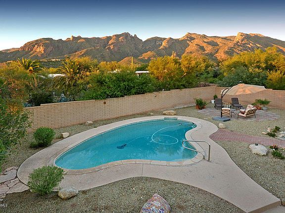 Extraordinary 3 bed 2 bath home with breathtaking mountain, city, and sunset views in desirable Catalina Foothills. Private 1/3 acre at end of a cul-de-sac. Adjacent to natural desert common area with N/S orientation and new gates. Updated kitchen with stainless appliances. Recently replaced water heater, faucet, and garbage disposal. Concrete floors. Recently painted inside and out. Full laundry room, 2 car garage with newer door & amazing storage cabinets. Expansive backyard with covered brick patio, uncovered patio and third patio with free standing ramada. Recently remodeled pool and pump with automatic water filler. Clean as a whistle and move in ready!