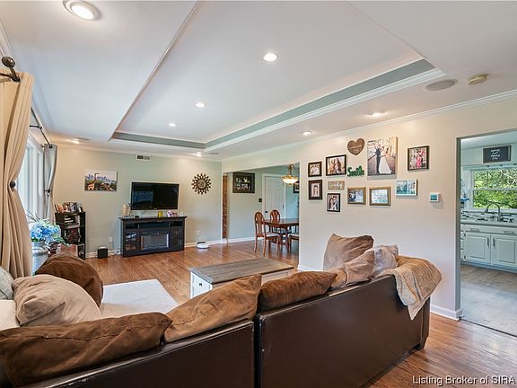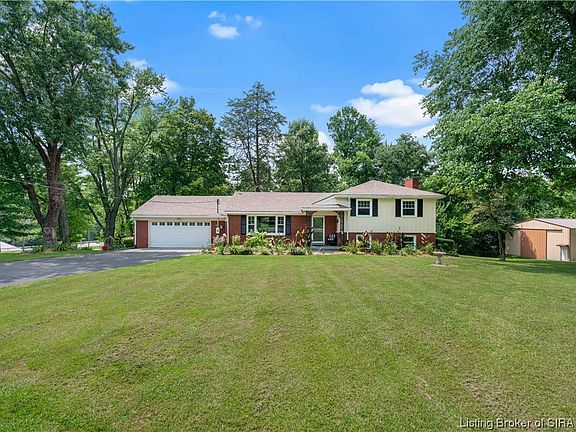 A MUST SEE …become the new owner of this unique 3 bed, 2 bath home on 1.39 acres in Floyds Knobs. Property features an attached garage & a 60' x 30' BARN/garage with 2 tall doors located on both ends, great for all your lg outdoor toys & 2 lofts perfect for extra storage. The home itself is packed full of character. When you enter you will notice the beautiful HARDWOOD floors, tray ceiling, & large picture window in the Living Rm that opens to the Dining area. The Kitchen provides New Quartz Countertops, beautiful back splash, newer stainless steel appliances, white cabinets, & tile floors. The splendid wood floors continue throughout all the bedrooms on the upper level & that bathroom was updated in 2018. Step down to the WALKOUT lower level offering a large Family Rm with newer LVP flooring, working wood burning FIREPLACE, updated bathroom in 2020, & added Mini Split in June 2018. The WALKUP basement is mainly drywalled, but no laid flooring, offers many options, even an extra bedroom. Outdoors you will enjoy the back patio, garden spot, & all the surrounding nature. Additional home improvements include exterior painted this summer, New Heat Pump installed Feb 2023, some new Windows in June 2021, & new Roof Aug 2017. Come see for yourself all the space & features this property offers. Sq ft & rm sz approx.