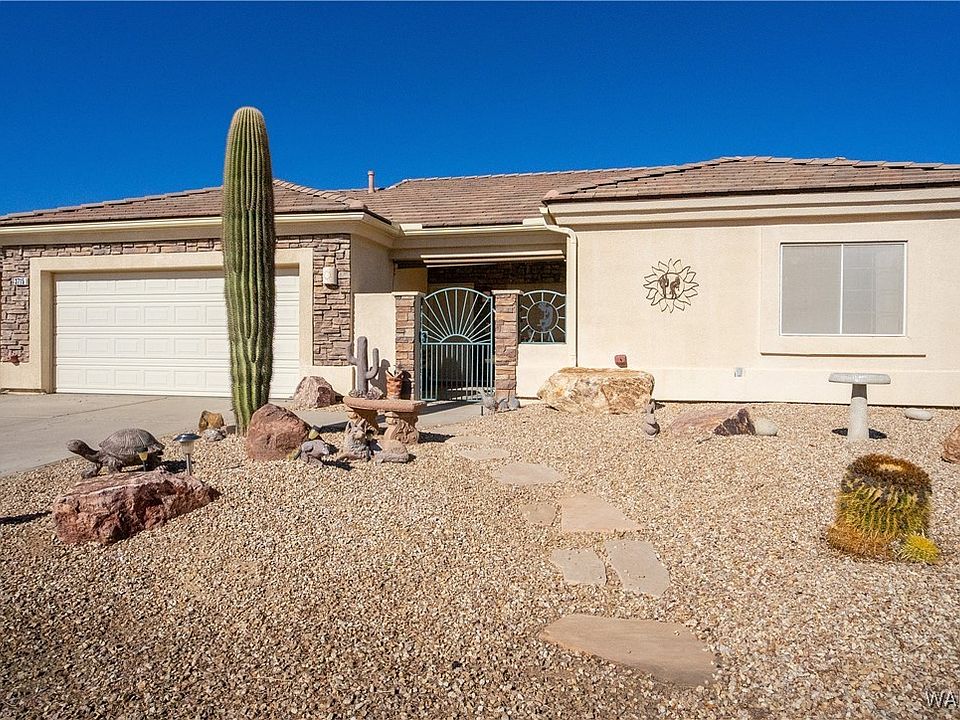 Welcome to this inviting 2-bedroom, 2-bathroom home in the heart of Kingman, Arizona! As you pull up you'll be impressed with the front landscaping and welcoming courtyard as you enter the home. This charming property offers 1,308 square feet of well-designed living space and is ready for its new homeowner. Step into the spacious floor plan with easy access and thoughtful features throughout, including wheelchair accessibility for added comfort along with a walk-in Jacuzzi bath tub/shower for convenience and accessibility in the second bath. The kitchen is open and bright with an attached informal dining space with views into the backyard and directly across from the good sized living room with vaulted ceilings. The primary suite is located in the rear of the home and is quite spacious with a large walk-in closet and primary bathroom with dual sink vanities and a stand-alone shower. The second bedroom is also large in size with two closets (one walk-in). There is lots of storage in this home! Enjoy the privacy of a fully enclosed backyard (with block walls), ideal for entertaining or quiet afternoons. The front yard is beautifully landscaped with low-water desert plants, providing a tasteful, low-maintenance appeal that blends perfectly with the Arizona landscape. A roomy 2-car attached garage offers ample storage and parking. This home is situated in an ideal location, close to shopping, medical facilities, and community events, making it a fantastic choice for those looking for convenience and a strong sense of community. Don't miss this opportunity to own a well-maintained, accessible home in a great location!