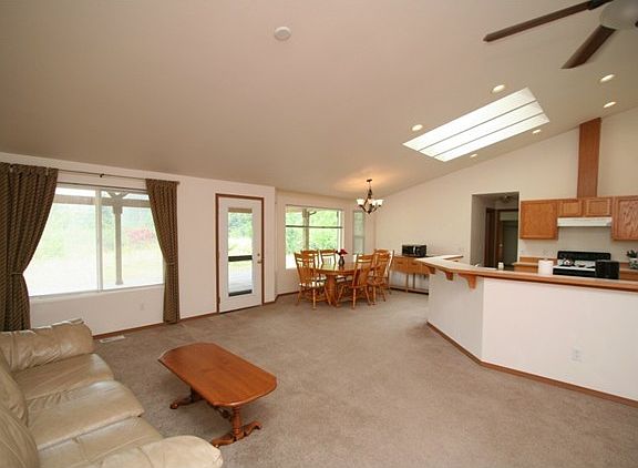 High Vaulted Ceilings and Skylights Throughout This Custom Rambler! Huge master suite with 5-piece bath and French doors opening to a covered back porch with opened beams and knotty pine ceiling. Kitchen with a breakfast bar opens to the great room & living room. 3 car garage plus 4 car shop with cedar lined office and 10' door. Located on just shy of 5 acres, with plenty of room for animals and minutes to downtown. Olympia Schools.