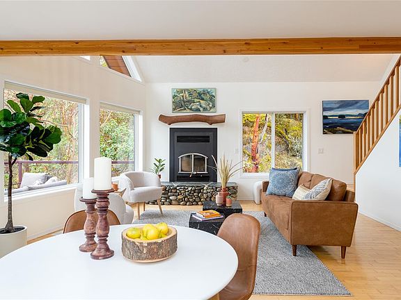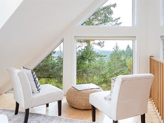 Custom cedar homeSweeping outlooks and sunsetsExpansive south-facing wrap-around deckFloor-to-ceiling windowsNatural lightMaple hardwood floorsSpacious primary bedroom