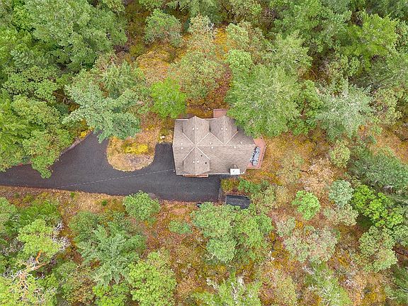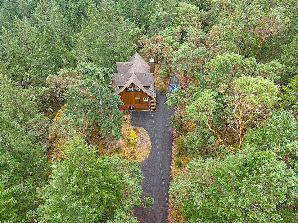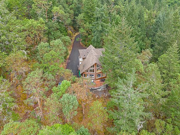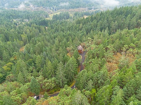 This bright and inviting 2005 custom cedar home was thoughtfully built to preserve nearly 4 acres of pristine natural woodland—a true hidden gem in the Eastern Highlands, featuring a NEW heat pump, surrounded by majestic arbutus and Douglas fir, yet only minutes from amenities. To protect the native flora and fauna, the owners commissioned a dedicated Landscape Restoration Plan, ensuring the land remains in harmony with its natural setting. Perched on a gentle rise and designed with an expansive wrap-around, south-facing deck, and vibrant sunsets. Inside, floor-to-ceiling windows flood the principal rooms with light while showcasing the vistas beyond. The open-concept layout features gleaming maple hardwood, soaring vaulted ceilings with striking exposed beams, and a stunning river-rock fireplace with an energy-efficient wood-burning insert. A rare blend of modern comfort and natural beauty, this home offers peace, privacy, and the essence of a true private retreat. Also NEW Driveway