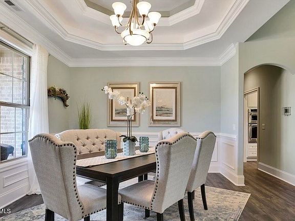 You will step onto a gorgeous stamped concrete front porch, up to double stained arched front doors. Inside these doors, you will walk into a foyer to find a dining room to your left with double lighted trey ceilings and beautiful wainscoting on the walls. There is a spacious living room straight ahead that features a vaulted ceiling with stained beams and a gas fireplace. To the back right, there is a cozy office with a coffered trey ceiling, and sliding glass doors onto the stamped concrete EZE breeze back porch. The living room also has access to the back porch with its triple slider back door. The kitchen offers a large island, quartz countertops, spacious cabinetry, a large walk in pantry with barn door, and a nook for morning breakfast. There will be plenty of seating in this house for family and entertaining! The master bedroom is massive with a lighted trey ceiling and lots of windows. The ensuite bathroom is an inviting retreat any day of the week with it's beautiful soaking tub, double vanity, and walk-in tile shower. The two other bedrooms on the opposite side of the house, features a guest suite with a vaulted ceiling, plenty of closet space and a large full bath. Before you head upstairs, there is a powder bath and laundry room with a drop zone. The upstairs bonus room is huge with it's own full bathroom. Through the sliding glass doors, you can walk onto the upstairs balcony and enjoy a one of a kind view. There is a patio off the back porch for BBQ and outside entertaining. The garage has beautiful black garage doors with an epoxy coated floor. The home also includes a gas Rinnai tankless water heater and full house generator hookup.