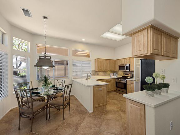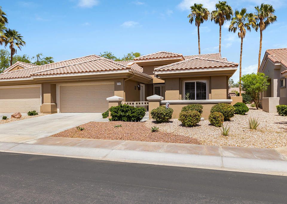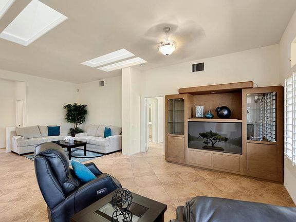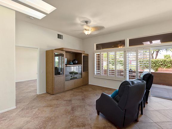 Sun City Palm Desert - Wonderful GREAT ROOM opal floor plan! 2 bedrooms 2 baths in a very convenient location near the Mountainview Clubhouse.10'' ceilings with multiple skylights make a Very light, bright and inviting home! 16'' tile throughout and freshly painted. Lovely eating area in the kitchen overlooking the exclusive back patio area. No homes behind this property!Convenient kitchen with beautiful corian counters, custom cabinetry and stainless steel appliances! Main suite is full of light with an additional skylight in the bath area. Dual sinks, walk in shower and fabulous well lit walk in custom closet. Secondary bedroom is near front of the home with bathroom close by. Nice separation from the master suite. Also includes an adorable office area. Garage includes lots of storage cabinets with reinforced shelves, epoxy like floor with Maytag washer and dryer. Practically new solar screens are available for every window. All in the wonderful community of Sun City Palm Desert.The painted exterior features a south facing covered patio overlooking the common area greenbelt. The main HOA includes the security, gates, amenities and clubs, Spectrum Cable with HBO and Showtime and internet. This care free home has an additional HOA that takes care of all landscaping outside of your patio, plant replacement, irrigation, stucco, paint, as well as roof maintenance and replacement.