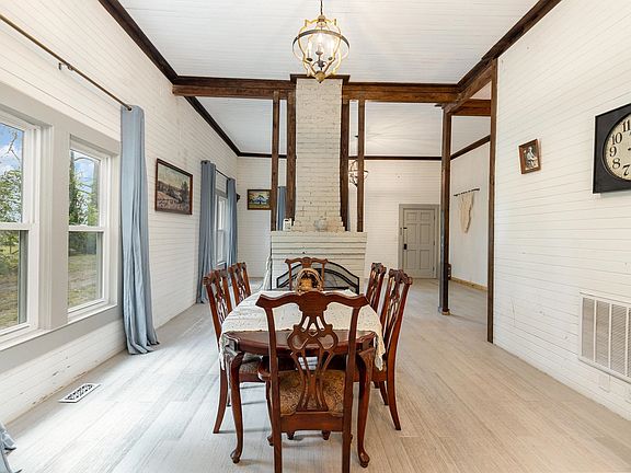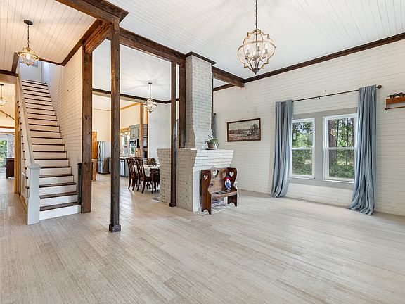 Old-World Charm With Modern Features! Renovated 1922 Farmhouse, with Covered Front Porch. Architectural Features such as Wooden Beams and Walls are a highlight of this Antique Beauty. The Dual Sided Wood Burning Fireplace Offers a Distinctive Focal Point to the Spacious Open Concept 1st Floor with 12' Ceilings. An Oversized Island with Concrete Countertops Contains a Cooktop, Ample Prep Area, and Seating. The First Floor Primary Bedroom Boosts a Walk-In Closet, Dual Vanity Sink, Walk-In Shower with Free Standing Tub. Flex Room on 1st Floor Overlooks the Expansive Front Porch. 3 Additional Bedrooms Upstairs. 2019-2020 Updates Include: Metal Roof, Siding, Windows, HVAC & Ducts, Insulation, Electrical, Plumbing, Kitchen and Baths. In Addition to the Home, the Property Includes a Fenced Horse Pasture, Cleared Acreage, Wooded Acreage, Two Stall Barn and Silo. Community Park with Playground and Walking Trails Nearby. Convenient to Highway.