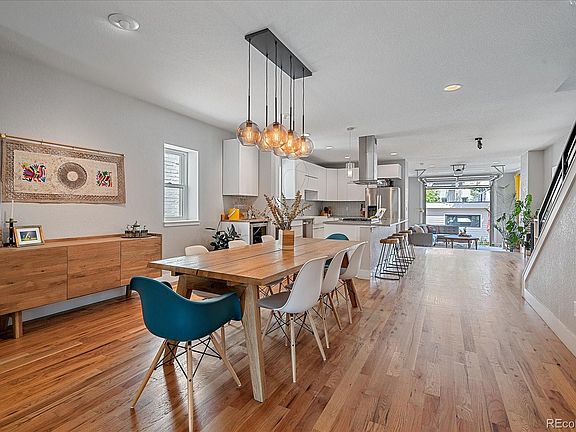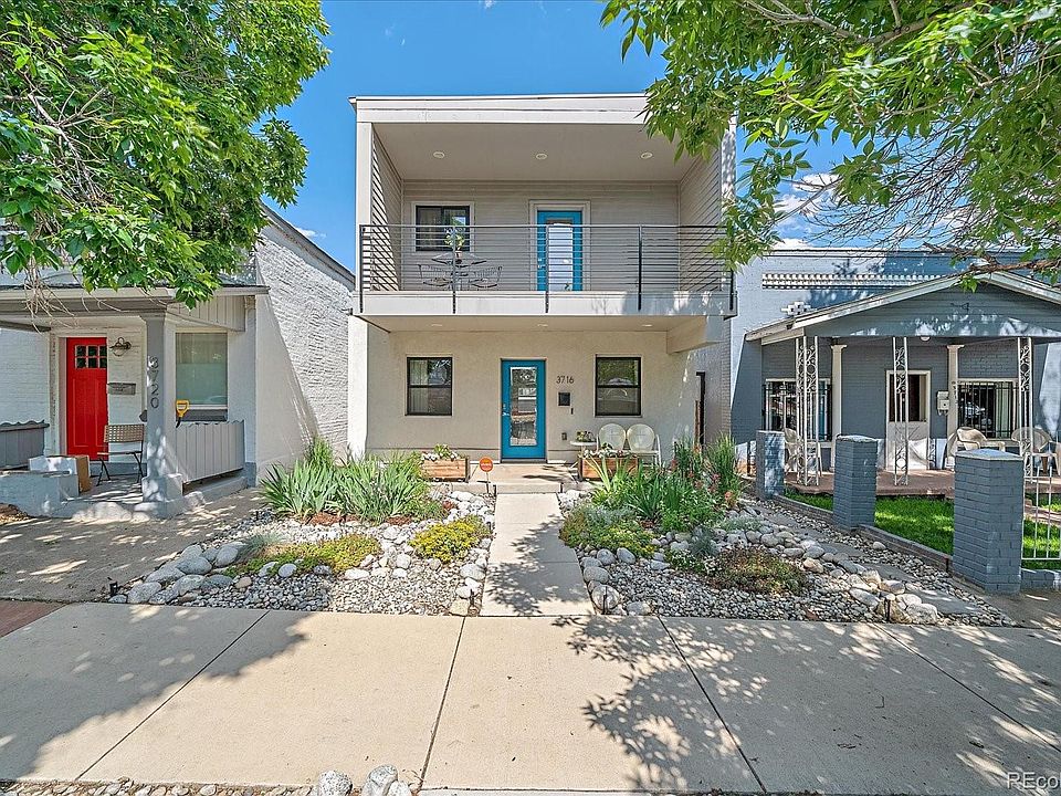 A Highlands/LoHi 2-Story gem! Open floor plan of all open floor plans has easily defined spaces you can personally create to fit your style and needs. The real show stopper being a garage door that opens straight from your main living space to the back patio and allows not only incredible natural light but a rare interior/exterior symbiosis of space. The back patio is a perfect spot for entertaining and private relaxation. A cook's kitchen has ample cabinet and counter space, with a large island countertop with bar stools (included), perfect for cooking up a storm for friends and family. Cleverly placed windows on the second floor balance privacy with plentiful southern light and views of downtown. Upstairs you'll find 3 bedrooms. One off the front with its own private balcony, great for a guest room, another makes a perfect office or workout room. The spacious 18'x14' Primary bedroom off the back has a private deck, spa-like bath with soaking tub. WAIT, don't miss the best part, a rooftop deck with incredible views of downtown and the mountains. With a walk score of 91 you can easily get to several coffee shops, Acova restaurant with ample outdoor seating, Wildflower for fine dining, Ace Hardware for small house projects, Avanti and more. Low maintenance xeriscaped yard with drip irrigation. Laundry is upstairs. 2 car garage. Both main and garage flat roofs with solar opportunities (ask seller for info). Over 700 sqft of extra storage space in the basement/crawl space area!!! Check out the youtube video here at https://www.youtube.com/watch?v=Voq0CcXne-4 or look at the links for 3D tour and drone/video through the home.