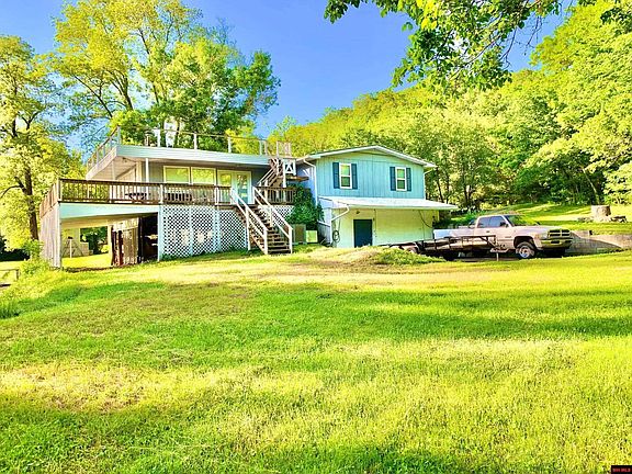 Peaceful countryside home on 15.59 acres m/l, with 2582 Sq ft, 4 bedroom, & 3 full baths. BBQ on the wrap around deck overlooking the pond. Swim in the pond, or fish off the dock. White Oak Creek runs next to the pond. Now connected to Bergman Water and a year round spring provides water to the home if desired. New updates include New Roof, Heat Exchanger and rural water. There is a large garden area. With 4 acres m/l of pasture, there is room for horses or cattle. There are 11+ acres of timber, with a cave. Open concept kitchen/dining area. Wood stove for back up heat. Shop area in basement. 12X24 storage building. Only 1/2 mile of gravel road.