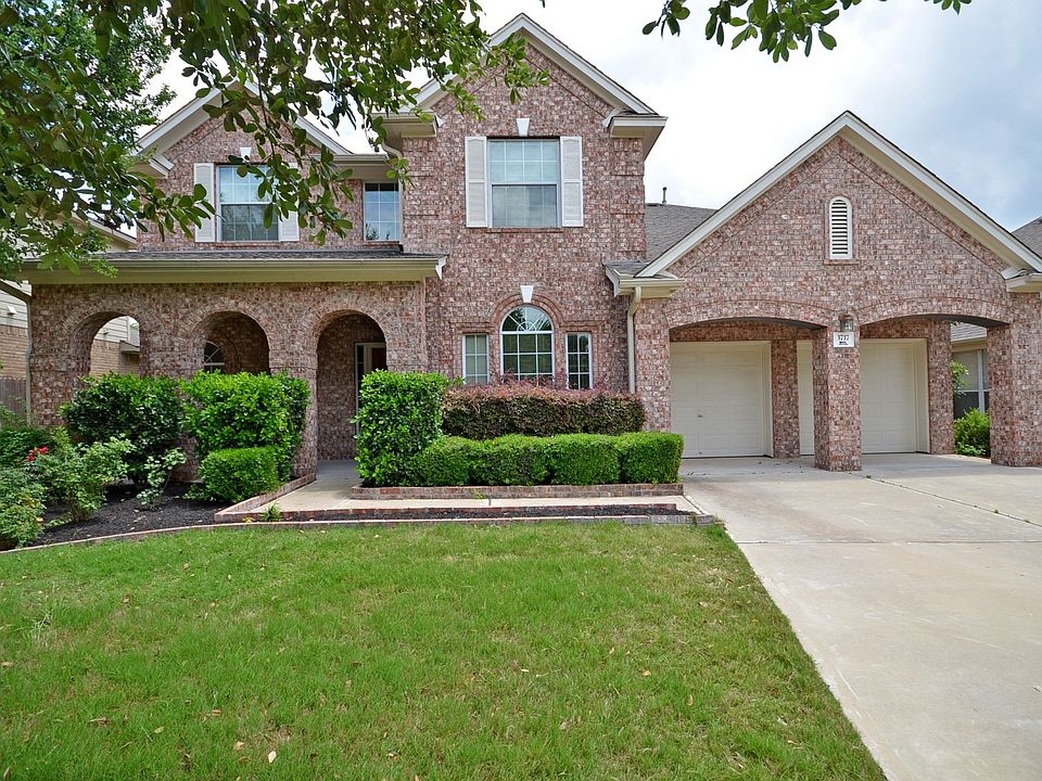 "Covered Front Patio, Gleaming Hardwoods, Majestic Live Oak Tree, Guest Suite, Sun Room and Game Room" Step-in to a breathtakingly beautiful floor plan with high ceilings and extensive mahogany wood flooring. An elegant tiled entry foyer leads to a gorgeous, formal dining room and formal living room. The foyer extends to a grand family room with double high ceilings, a wood burning fireplace and a wall of beautiful windows. The island kitchen has beautiful, granite counters and island with a breakfast bar, hard wood, raised panel cabinets, built-in appliances, and a large breakfast area with a bay window. The bay window breakfast area provides a relaxing view of the lushly landscaped rear yard with landscaped beds and a mature live oak tree. The downstairs includes a peaceful sunroom with nine windows! The Master Suite is spacious, has a luxurious master bath with a garden tub, separate shower, dual vanities and two walk-in closets. Additional features: Full sprinkler system, Loft style game room, NEST thermostat, speakers in family room and a soft water system. Call Bob today at 512-616-4100 for an immediate showing of this timeless home. For 24 HR Information, call 1-800-969-8412 and enter extension 6231. Just enter the extension. No Agent will answer!