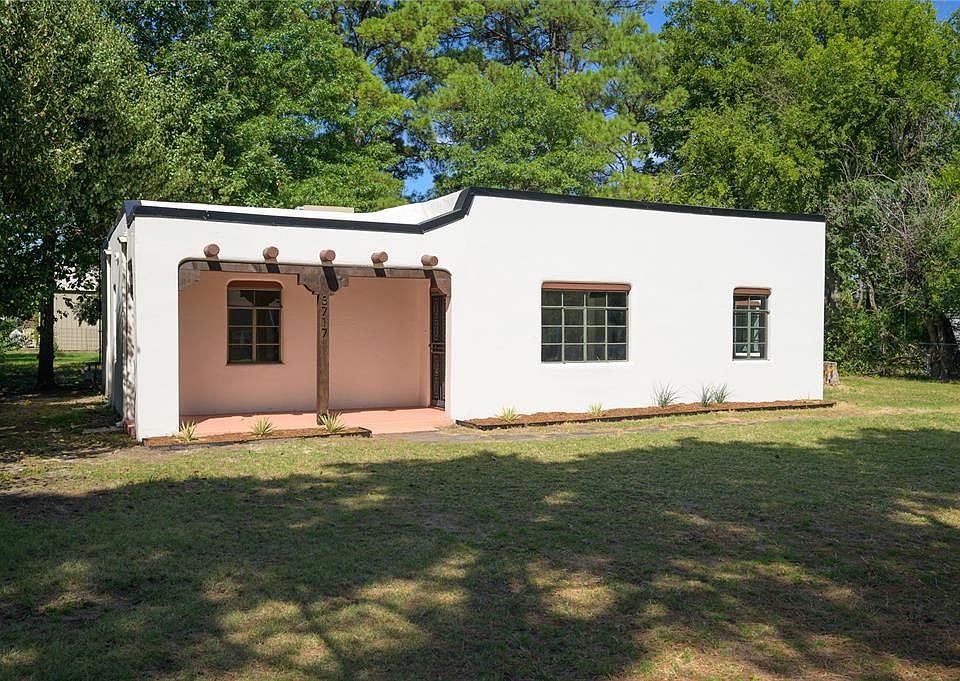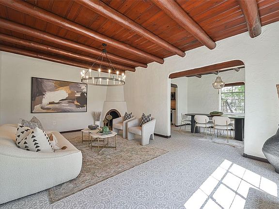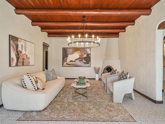 This Spanish Pueblo Revival has been brought back to life with modern updates for today’s lifestyle, all while maintaining its timeless character and charm. Nestled on nearly half an acre of land with mature trees, this home exudes warmth with its intact exterior details and cozy interior. Inside, you’ll find beautiful rounded walls, an original corner fireplace, stunning wood ceilings, and charming beams above the windows, adding to its inviting atmosphere. The fully remodeled kitchen features new cabinets, granite countertops, designer tile, floating shelves, stainless steel appliances, and a pantry. The bathroom has also been tastefully updated with a new vanity, stylish tile, and a walk-in shower. Two bedrooms are conveniently located near the full bathroom, while an additional bedroom or office space is situated on the opposite side of the house, near the laundry room and half bath. Outside, a spacious covered back patio overlooks the serene backyard. For those who enjoy hobbies, there’s a large 2000 sq. ft. (mol) metal workshop. This truly special and unique home is waiting to welcome you.