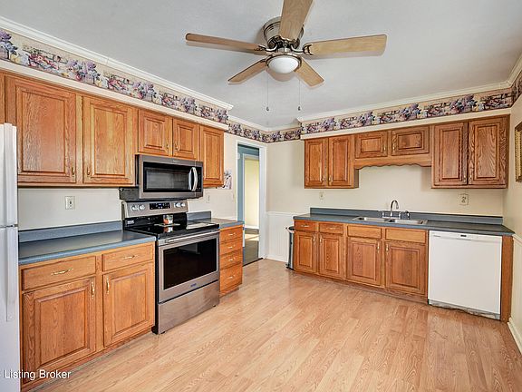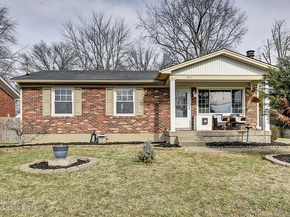 Nice Ranch! 3 beds, 1.5 baths, finished basement, fenced rear yard, and spacious 2 car detached garage! Covered Front porch, updated Champion windows throughout. Hardwood on main level except kitchen and bath. Spacious Eat-in Kitchen. Basement has large family room with built-in bar and wood burning fireplace, additional room, ½ bath, laundry and storage space. Large wood outbuilding remains. Large 2 car garage, patio area and fully fenced rear yard. Located in great location just minutes from I-65, shopping and restaurants. Home IS NOT located in FEMA Special flood Hazard Area per MSD flood plain determination. Some cosmetics needed, priced accordingly.