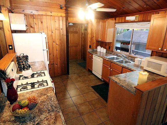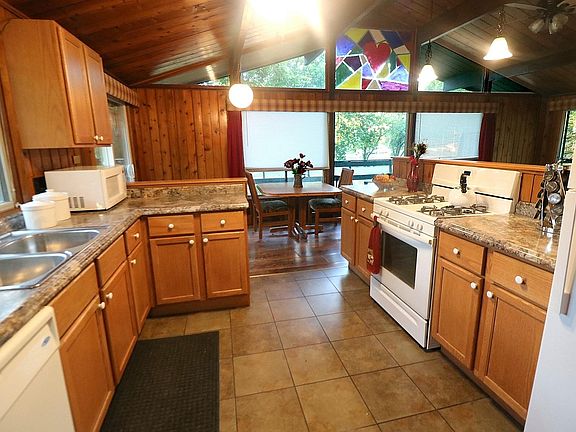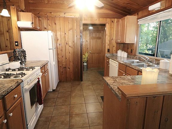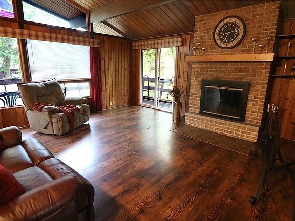 If you like rustic, you're definitely going to love this home with a great open floor plan, vaulted ceilings and a wall of windows to enjoy the views! There are 2 bedrooms on the main floor, plus a room in the basement which was utilized as a 3rd bedroom that has 2 closets, with one closet backing up to a wall with plumbing behind it. All appliances are included and the refrigerator and the air conditioner are brand New! The living room/great room also has a full masonry fireplace with some adjacent built in shelving. Enjoy the huge wrap around deck accessible from 2 sets of sliders and also having 3 sets of access stairs and a couple of built in benches. The full basement is very spacious and has loads of shelving for storage, plus a workbench and some overhead cabinets. There is a deep, oversized, 2 car garage with a workbench and some overhead cabinets plus there's a large storage shed with plenty of shelves for storing all of your yard and garden supplies. This wooded lot has perennials too! You're just a couple of blocks from the Lake and Lake rights are included! Make this your new Home Sweet Home!